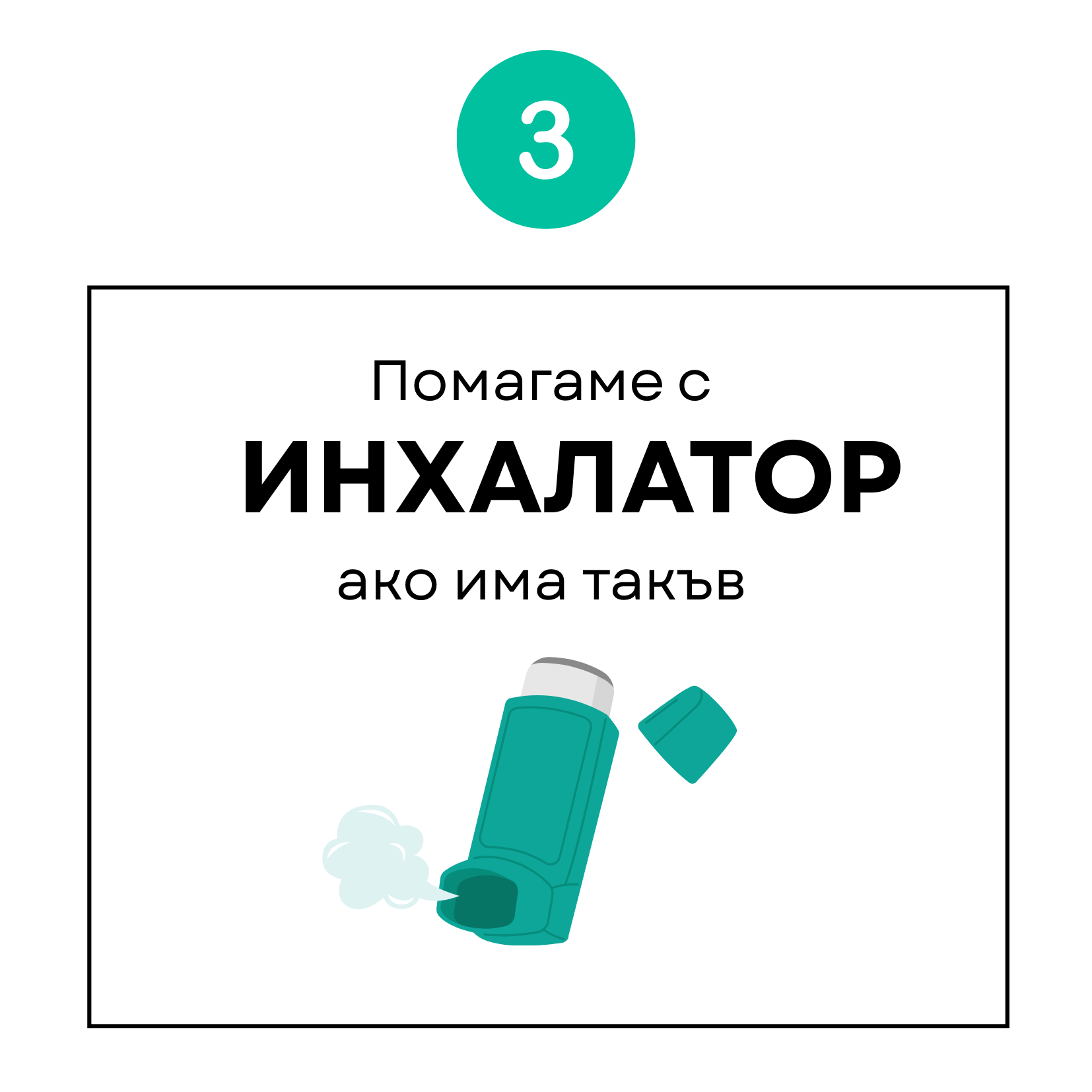 Ако пострадалият има предписан бързодействащ инхалатор, помогнете му да го използва. Обикновено се правят 1-2 впръсквания според указанията:
